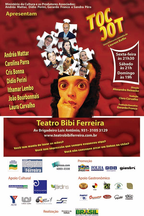 Esta demora no atendimento cria uma situação inédita e divertidíssima: os pacientes, que no início estavam desconfortáveis com seu TOC, acabam formando um grupo de terapia que se auto-analisa. Em meio a crises, brigas e muitas risadas, o espectador acompanha as dificuldades e bizarrices de cada tipo de TOC, bem como a maneira de lidar com elas. “ TOC TOC “ escrita pelo autor francês Laurent Baffie aborda de maneira divertida o Transtorno Obsessivo Compulsivo, uma doença que atinge parte da população mundial.